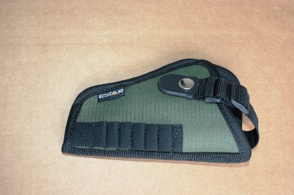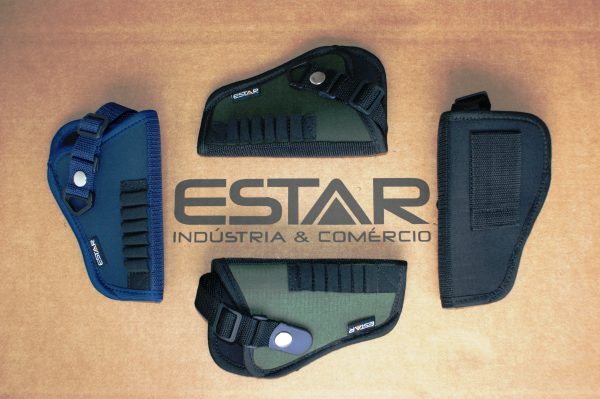 Coldre saque rápido para revolver 38 cano alongado confeccionado em nylon ripstop e botão de pressão.